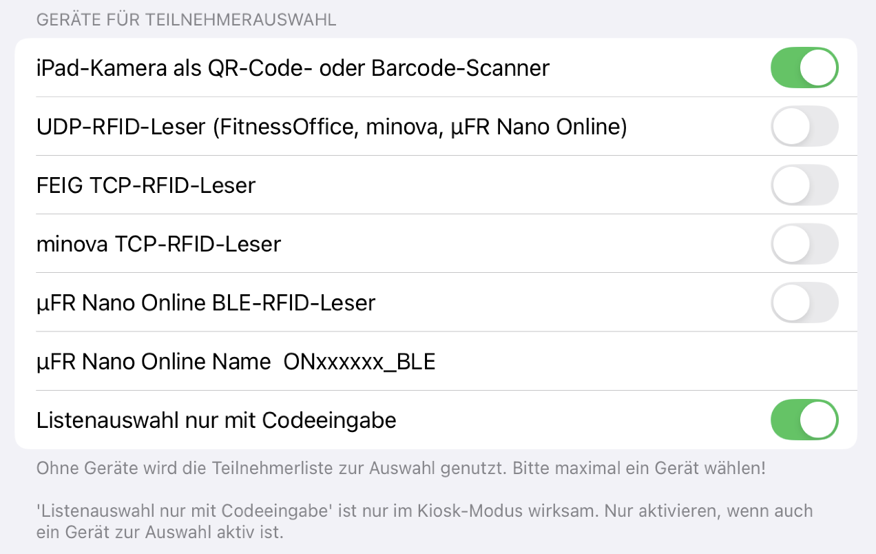 Aktivieren Sie in den Einstellungen zur Teilnehmerauswahl ein Gerät und die Option "Listenauswahl nur mit Codeeingabe". Außerdem muss der Kiosk-Modus aktiv sein (siehe im entsprechenden FAQ).