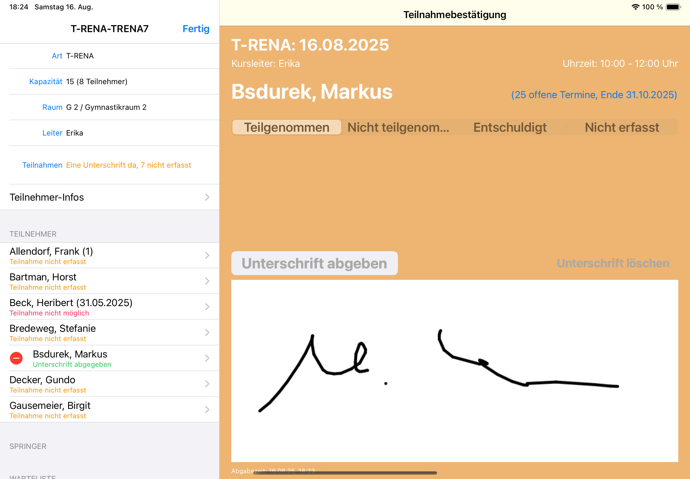Ja, wenn der Kiosk-Modus aktiv ist. Dann erscheint oberhalb der Kursinformationen in der Kursansicht ein "Bearbeiten"-Button. Vor den Einträgen mit Unterschrift erscheint ein rotes Lösch-Symbol, wenn der "Bearbeiten"-Button gedrückt wird. Wenn Sie eines der Löschsymbole auswählen, wird die Unterschrift nach Eingabe des Codes für den Kiosk-Modus gelöscht. Danach auf "Fertig" tippen.