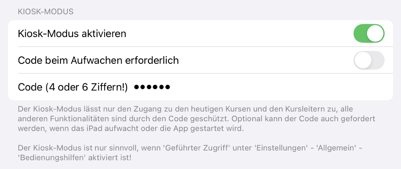 Der Kiosk-Modus schützt sensible Daten der Teilnehmer und sorgt dafür, dass bestimmte Funktionen von RehaSport Sign nur von den Kursleitern aufgerufen werden können. Wenn diese Funktionen aufgerufen werden, erscheint eine Passwortabfrage. Das Passwort (ein vier- oder sechsstelliger Zahlencode) kann in den Einstellungen von RehaSport Sign festgelegt werden.